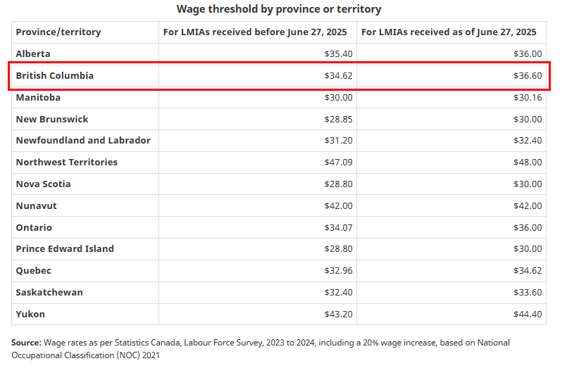 The June 27, 2025 update raised regional wage thresholds, which determine the high-wage vs low-wage LMIA classification.